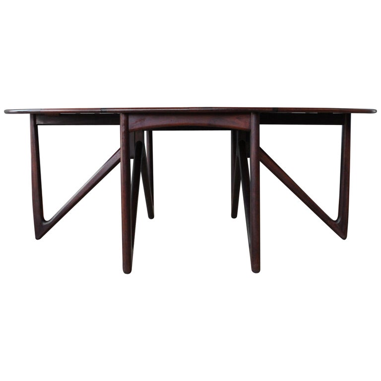 A dropside table with deep flaps, of which one or more legs is hinged, able to be opened to support the flap when raised.