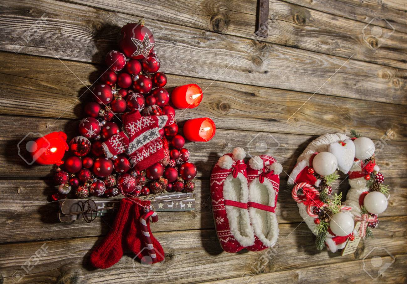 Decorate your home this holiday season with our chic decorating ideas and inspiration. Classic christmas decoration in red and white with two burning candles on wooden background. Cinnamon sticks can be used for gift tags.
